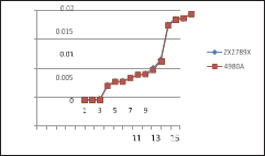 測(cè)試速度快了,還必須保證測(cè)量數(shù)據(jù)的穩(wěn)定性,左圖是兩種不同的 機(jī)型,大家都用各自的最快測(cè)試速度,掃描測(cè)試同一個(gè)網(wǎng)絡(luò)變壓器同一 個(gè)繞組的漏感15次的測(cè)量數(shù)據(jù)分布圖,我們可以看到,ZX2789的測(cè)量數(shù) 據(jù)的一致性要略好一些。